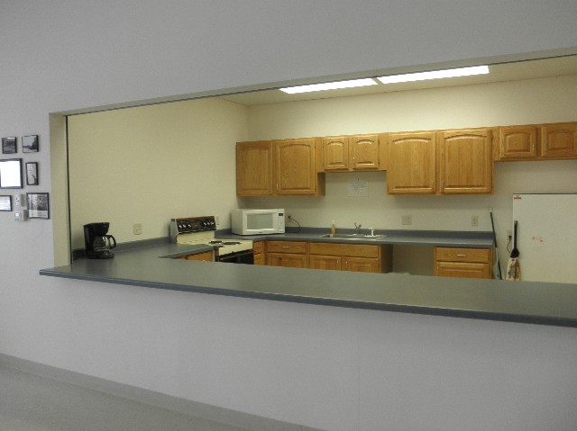 The building has a completely equipped kitchen with stove, refrigerator and microwave. The kitchen provides wide, roomy counters including a serving counter that is open into the large, inviting meeting room, making food preparation and serving easy and allows for quick, simple cleanup.