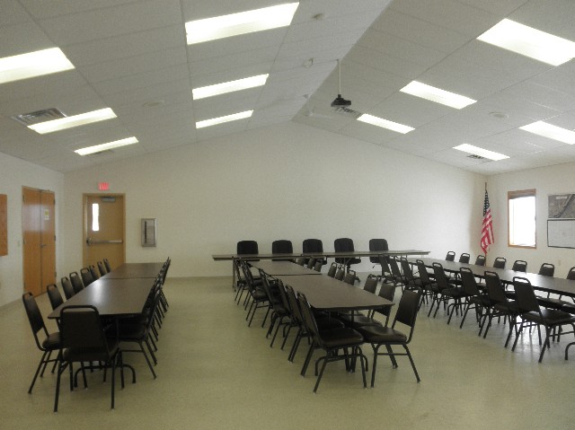 Tables and padded chairs to accommodate 196 people are furnished. The building is air-conditioned in the summer and provides an inviting gathering place for any group activity. There is a convenient, ample parking in front of the building, with picnic tables and a play area to entertain children.